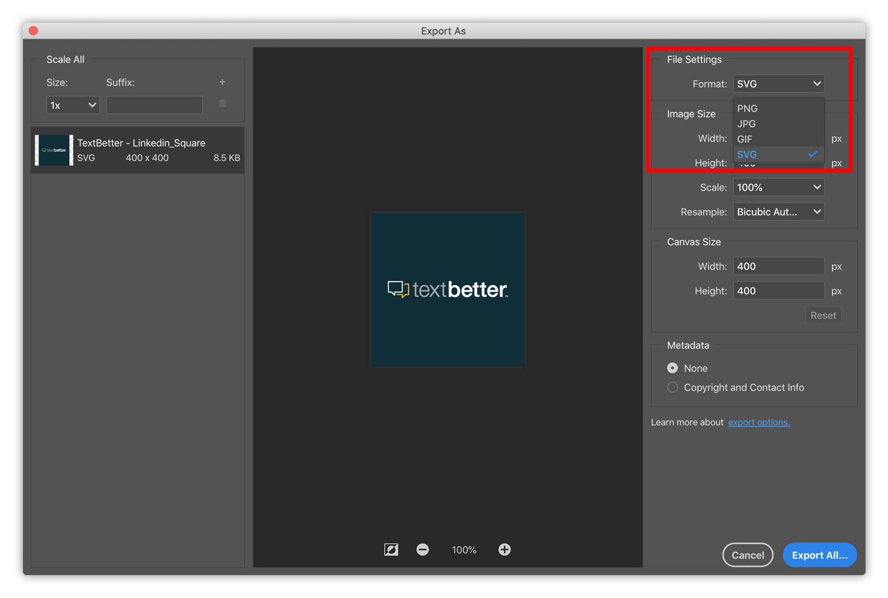 - From the Export As popup window, choose the SVG file format from the File Settings section and specify the Image Size that you want to export it as