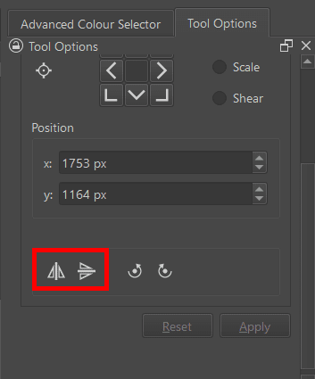Once the tool is active, look for the flip icons in the Tool Options Docker. The first icon flips the canvas or layer horizontally, while the second icon flips the layer or canvas vertically. Scroll down in the docker if you can’t see them immediately.