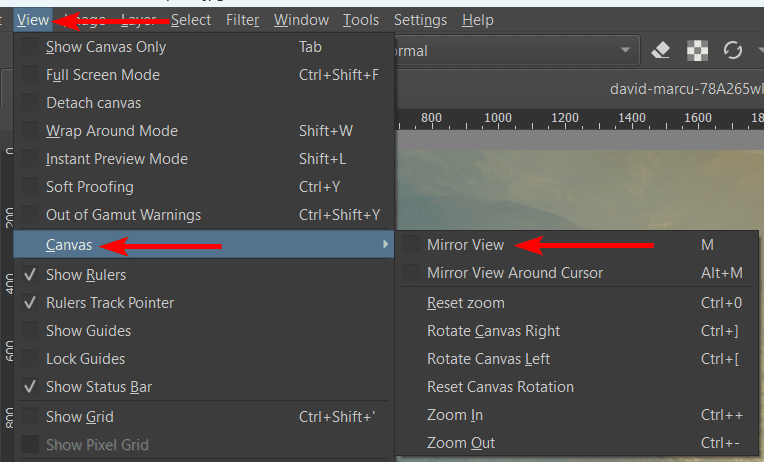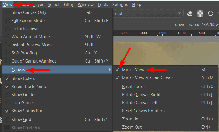 To reset the canvas back to its original position, click M again or follow the same menu path. You will notice Mirror View has a tick next to it when it’s active.