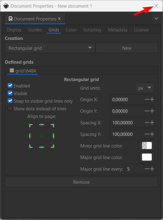 Once you have adjusted the settings as needed, click X to close the document properties window.