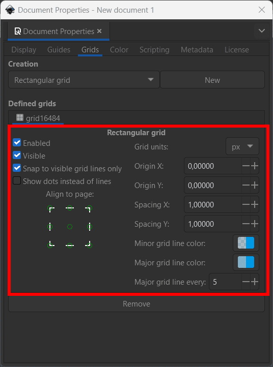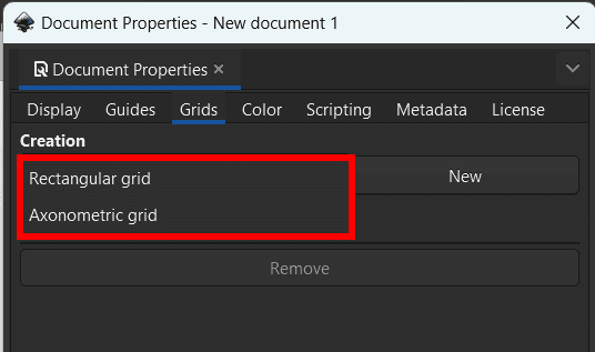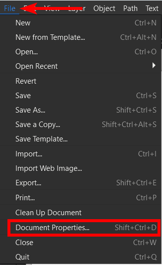 To add the grid, open the document settings by going to File > Document roperties. You can also use the shortcut Shift + Control + D on Windows or Shift + Command + D on Mac.