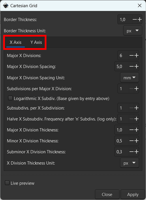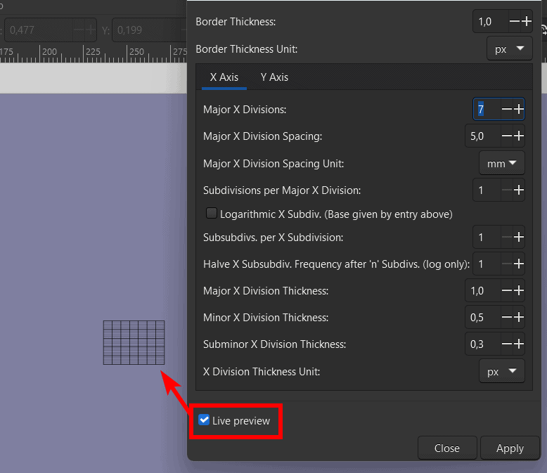 There are several options to adjust to create the type of grid you want. You can change the Border Thickness, the major and minor divisions, and the thickness for both the x and y-axis. Click on the X or Y axis tab to adjust the settings for the columns and rows within the table.