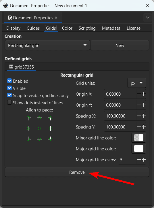 However, if you want to remove them to see how the design looks without the guidelines, re-open the Document Properties window and the Grids tab, then click Remove at the bottom.