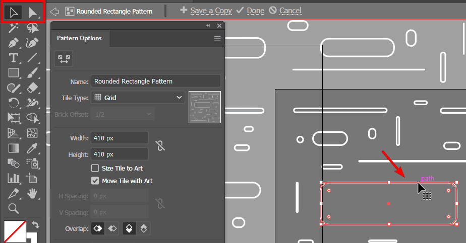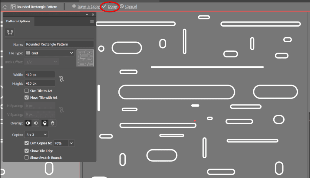 When you are happy with the pattern, click the Done button at the top of the Pattern Options panel or press Esc. This will save the pattern to the Swatches panel and exit the pattern editing mode.