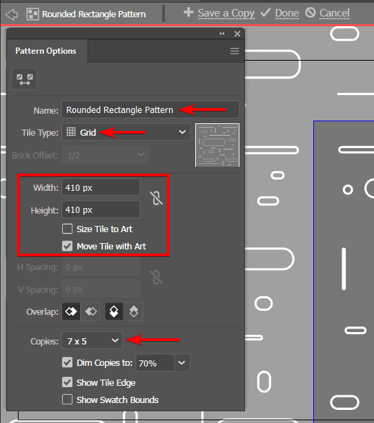 In the Pattern Options panel, you can name your pattern, choose the tile type, adjust the size and spacing, and change the alignment and overlap of the pattern. You can also see how the pattern will look in different modes, such as dimmed or outlined.
