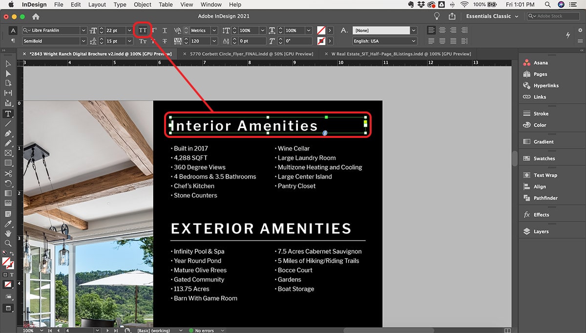 - From the top Option Bar (right above the work area), or from the Character panel (Window > Character), click the icon showing two capital "T"s