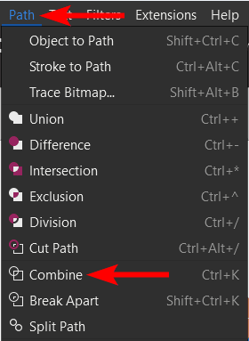 Once the objects are selected, go to Path > Combine or use the shortcut Control + K on Windows or Command + K on Mac.