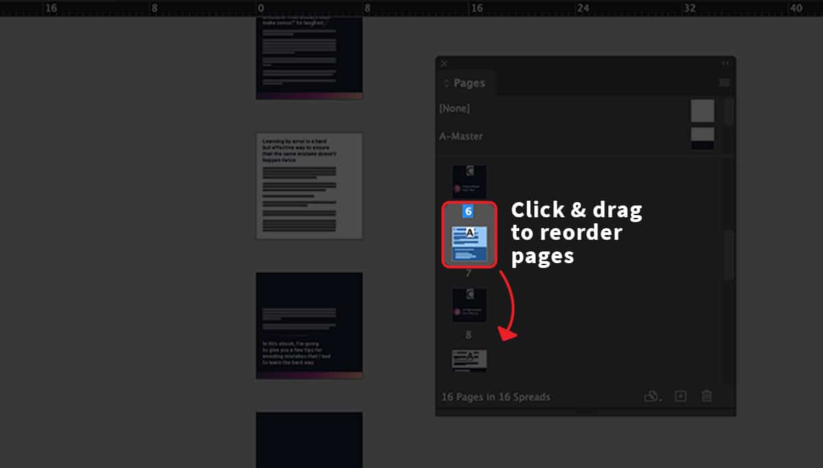 - From the top Pages panel, you can simply click-and-drag the page preview icons up and down to reorder them