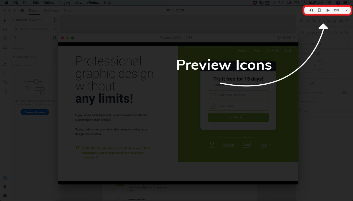 - Or click the desktop or mobile preview icons from the top right corner of the XD app to launch the preview option.