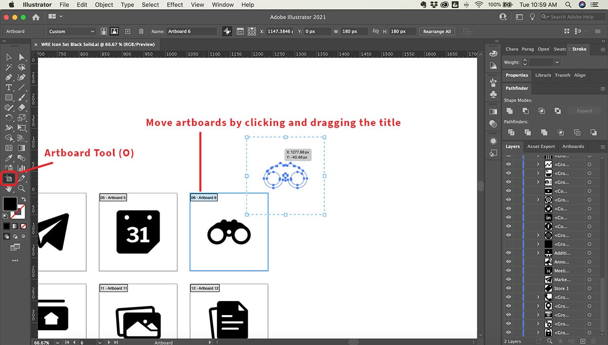 - To move multiple artboards, hold down the Shift key and click on the title area of each artboard you want to move