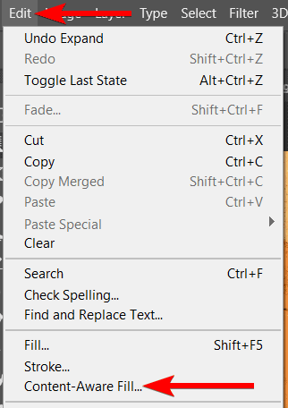 You can now start with the Content-Aware Fill process. To use this feature, go to Edit > Content-Aware Fill.