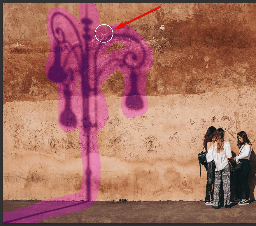 Now, you can use the brush to paint over the areas you want to remove. The painted areas show as a magenta mask. Paint slightly over the background to show Photoshop what you want to replace the removed object with.