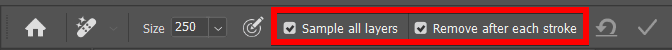 Adjust the Remove Tool’s settings in the Upper settings bar. Since you are working on a new layer, ensure that Sample All Layers is checked. Then, if you want the tool to work after each brush stroke, check the box next to Remove after each stroke. Otherwise, leave the second box unchecked and press Enter to activate the tool after painting.