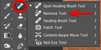 First, select the Remove Tool from the toolbar. You will find it in the fly-out menu underneath the Spot Healing Brush Tool, or you can press Shift + J to scroll through the tools until you access it.