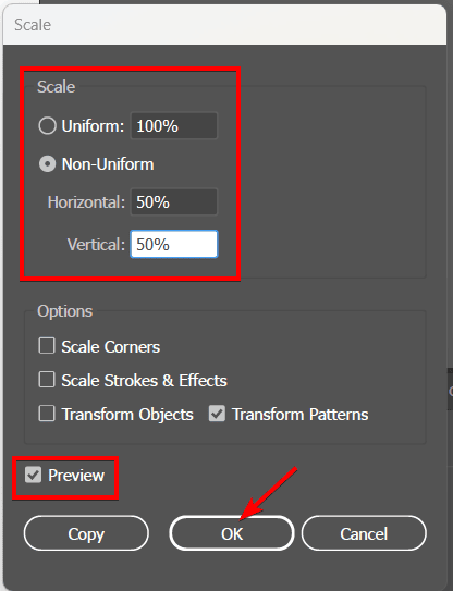 Double-click the Scale Tool in the Tools panel to open the Scale dialog box. You will see various options for scaling the object and the pattern.