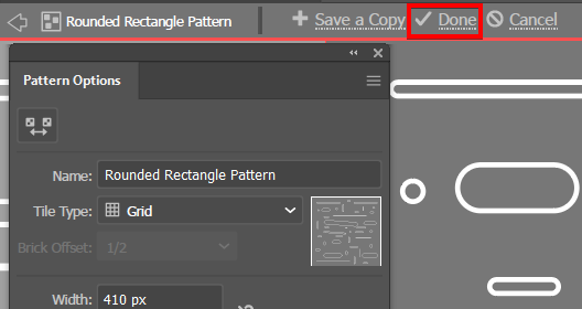 You can also use the Width and Height inputs to set the size of the pattern tile. You can type a value or use the up and down arrows to increase or decrease the size. You can edit the other settings as needed and click Done to confirm the changes.