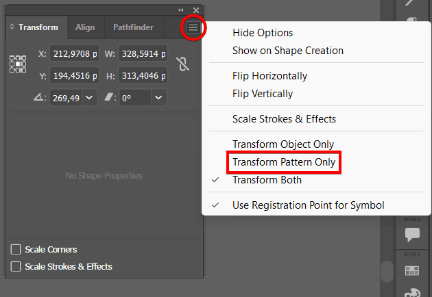 - You can use the Transform Panel, which lets you edit the pattern in other ways, such as rotating it.