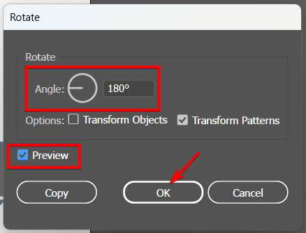 Set the Angle to the degree you want to rotate the pattern. Ensure that Preview is enabled to see the changes on the page. Click OK to confirm the changes.