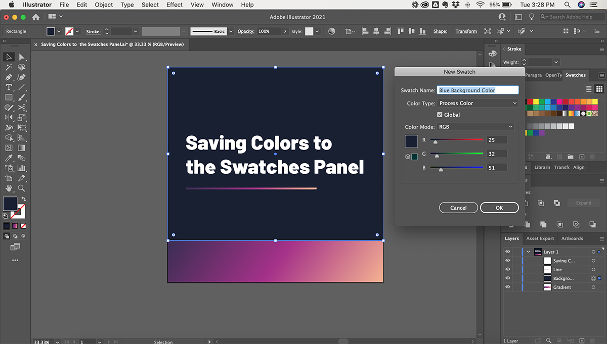 Pro Tip: Make sure the "Global" checkbox is selected when creating a New Swatch. This will allow you to edit the swatch later on if needed, and all objects using that color will update as well!