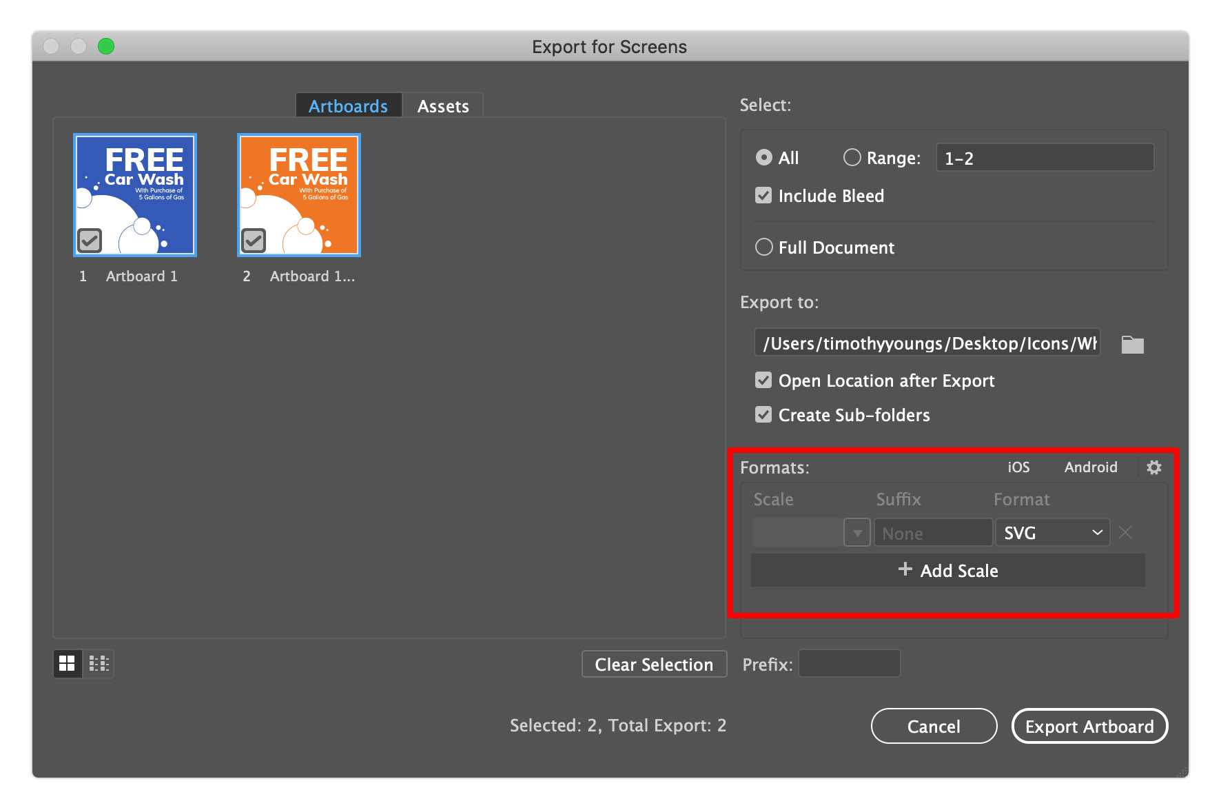 - Click Export Artboard