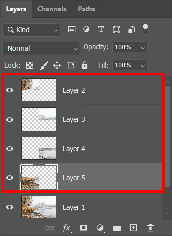 You can now use either of the top two methods to split the image. You can use the Rectangular Marquee Tool to create four selections that you copy onto separate layers for individual editing. Remember to make the selection on the original layer each time and not the new layer with a section cut-off. You will see the separate layers in the panel on the right.