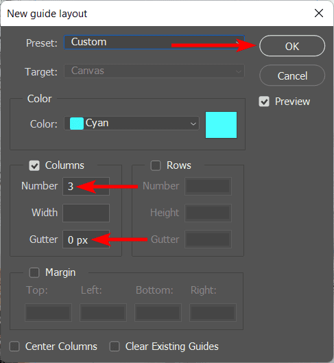 In the new guide layout box, add the number of guides you want by changing the number of rows and columns. If you want to split your image into three vertical sections, add 3 into the Columns box. Make sure you set the Gutters to 0 px. Click OK when you have added the number of columns and rows you want.