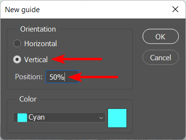 If you want to place the guide vertically in the center of the image, click on Vertical and then type 50% into the position box.