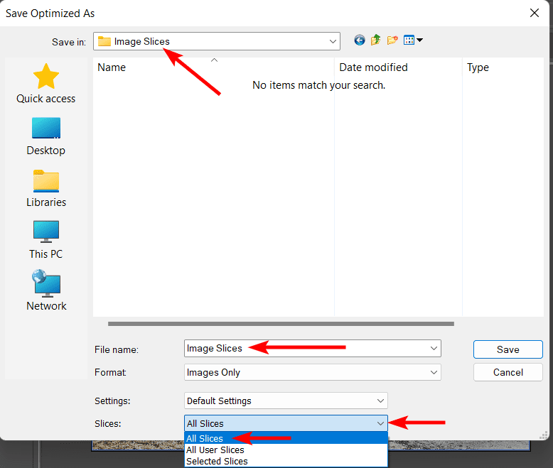 When the save as window opens, name the file, select the folder to save it in, and use the drop-down menu at the bottom to select All Slices.