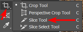 Create the slices by selecting the Slice Tool, which you will find by holding down on the Crop Tool.