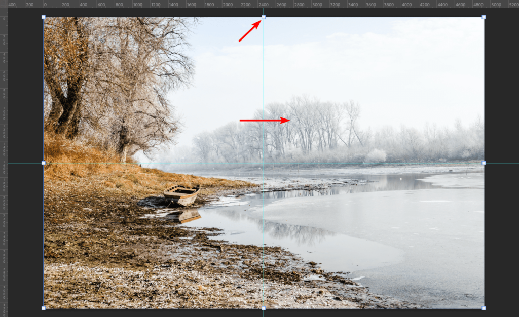 You can use these blocks as a guide or look at the numbers on the ruler to find specific spots in the image. Once you know where you want to create your selection, you can add a guide by clicking on one of the rulers and dragging it down onto the image.