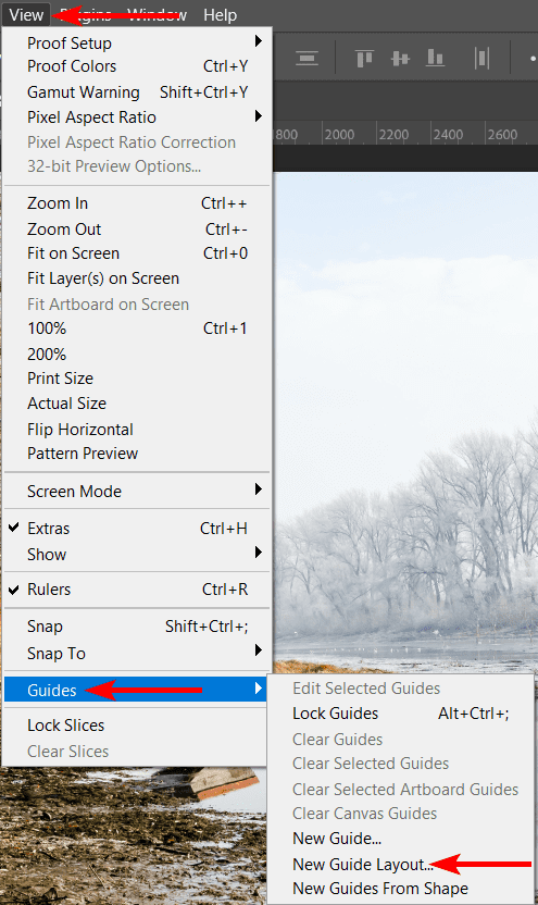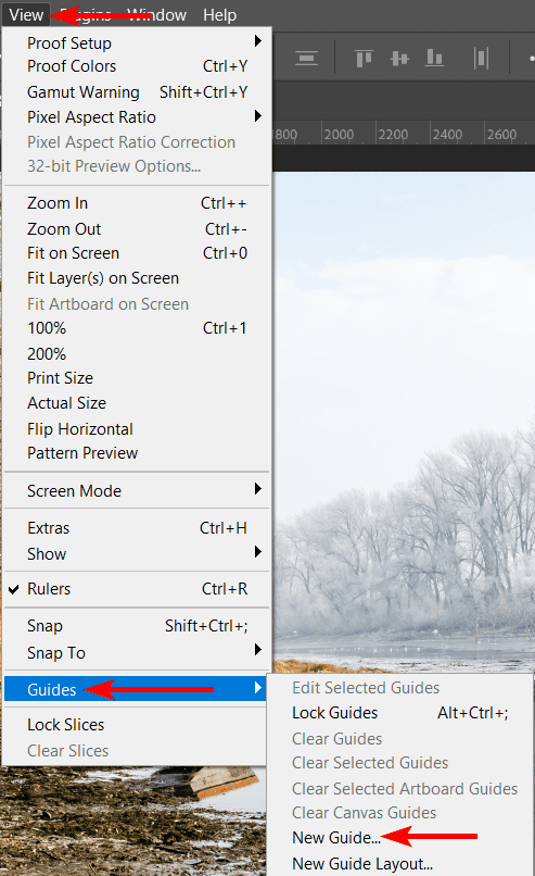 Then, use a Guide to find the center of the image if you want to cut the image in half or edit half of the image. Click on View > Guides > New Guide.
