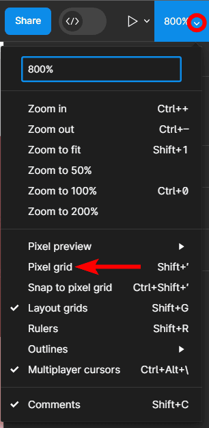 You can now show the pixel grid on the canvas to see where the objects will snap to. To turn the pixel grid on, open the Zoom settings using the small arrow next to the percentage, then click on Pixel Grid. You can also use the shortcut Shift + ‘ (apostrophe) on Windows and Mac to toggle the grid on and off.