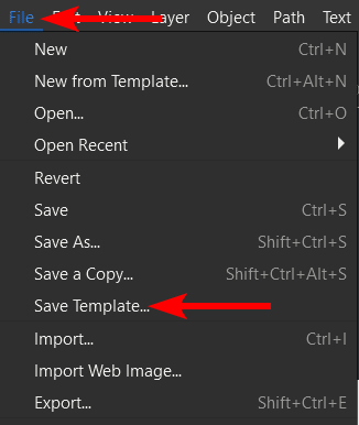 Remember that everything on the canvas will be saved in the template, so customize the canvas or delete all the objects if you only want the document size as the template. Then to save the template, go to File > Save Template.