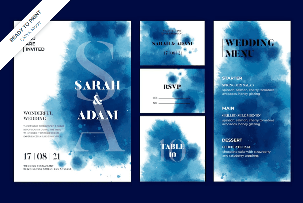 This template is complete with wedding stationery, including an RSVP card, table number card, menu, and invitation card with a blue watercolor theme across each template. The template is already in CMYK mode, so it's print ready.