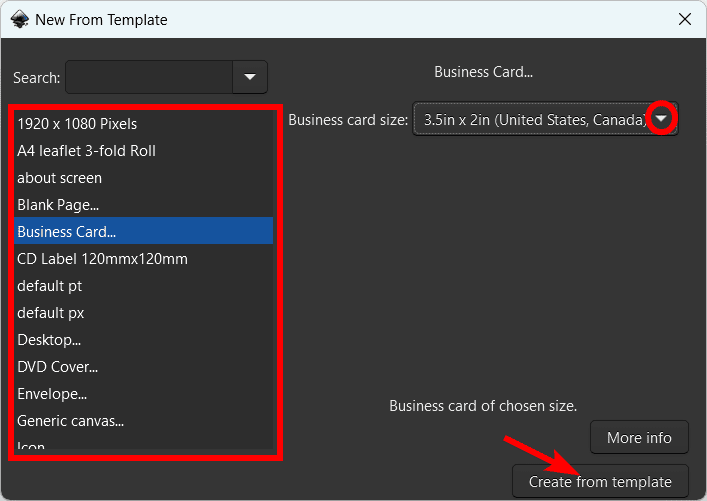 You can then choose a template from the list. Some templates give you options, such as the Business card, so you can match the size your country uses. Click Create from template to open a canvas at that size.