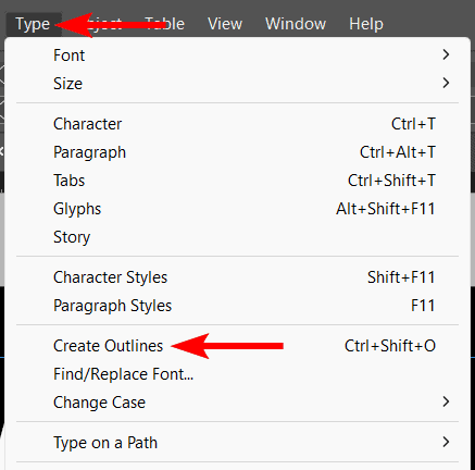 Once the text is on the canvas, select it using the Selection Tool (V). Then, go to Type > Create Outlines. You can also use the shortcut Shift + Control + O on Windows or Shift + Command + O on Mac.
