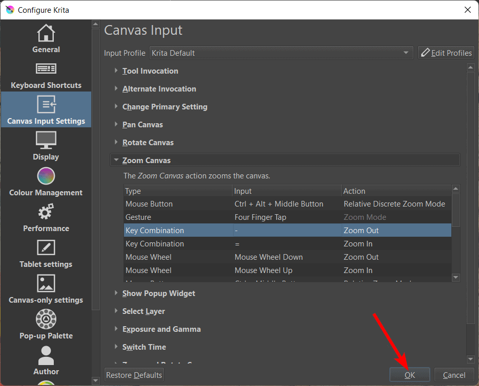 If the current shortcuts to zoom in or out in Krita don’t work with your workflow, or if you think a different shortcut is assigned to the zoom function, you can check and change the shortcuts. You can also restore the settings to change the shortcuts to the default ones.