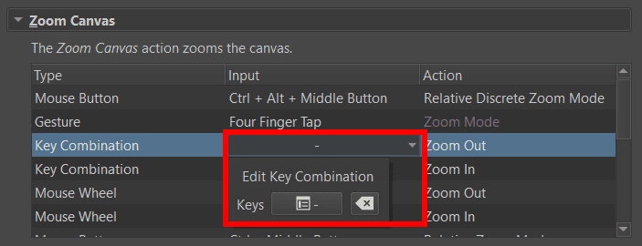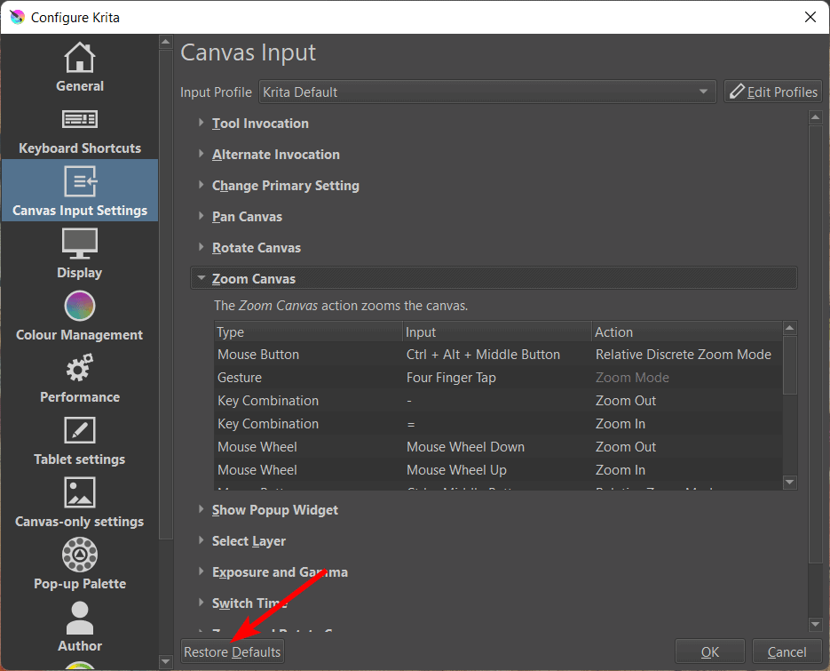 Note: Restoring the default settings reverts all the Canvas Input Settings to the default settings. Ensure you are okay with every setting (and not only the zoom functions) being changed before clicking the button.
