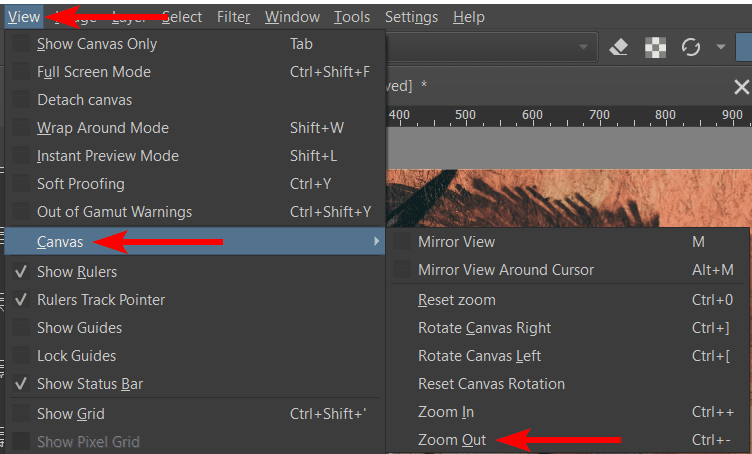 There are also many ways to zoom out in Krita. The quickest way to zoom out is to use the keyboard shortcut, the - (minus key). You can also use Control + - on Windows or Command + - on Mac, which zooms out in set increments.
