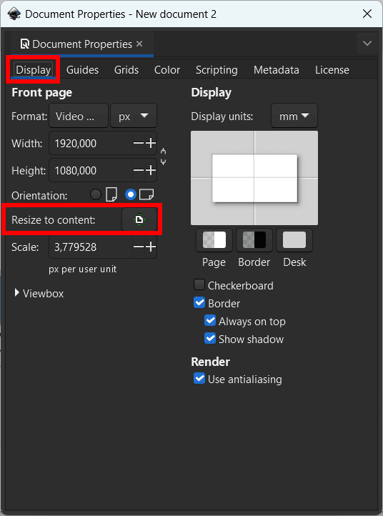 Once you are in the Document Properties Panel, stay in the Display tab, and click on the button next to Resize to content. The document will automatically resize as you click the button.