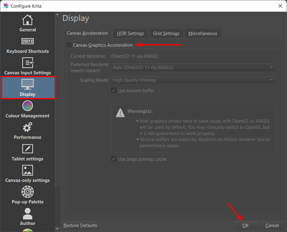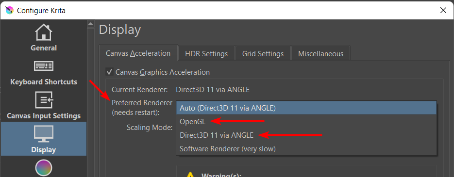 Follow the previous section to find the display settings by going to Settings > Configure Krita and selecting the Display tab. Once the tab is open, use the drop-down menu next to Preferred Renderer to change the settings.