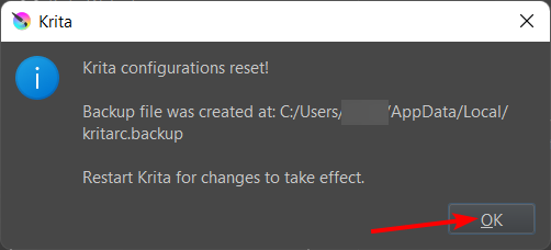 Krita then displays a message to say that the configuration was reset and shows where a backup file is saved on your device. You can find the backup and rename it to “kritarc” if you want to restore the settings at any stage. The reset will only take effect when you restart the program.
