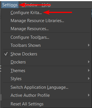 To disable canvas acceleration, open Krita, go to the Settings menu and select Configure Krita.