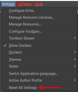 To reset the Krita configuration, open the program, click on the Settings menu, then select Reset All Settings.