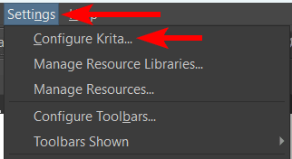 Once you have re-opened Krita, you need to find the pressure sensitivity option to toggle it on and off. To do this, go to Settings > Configure Toolbars.