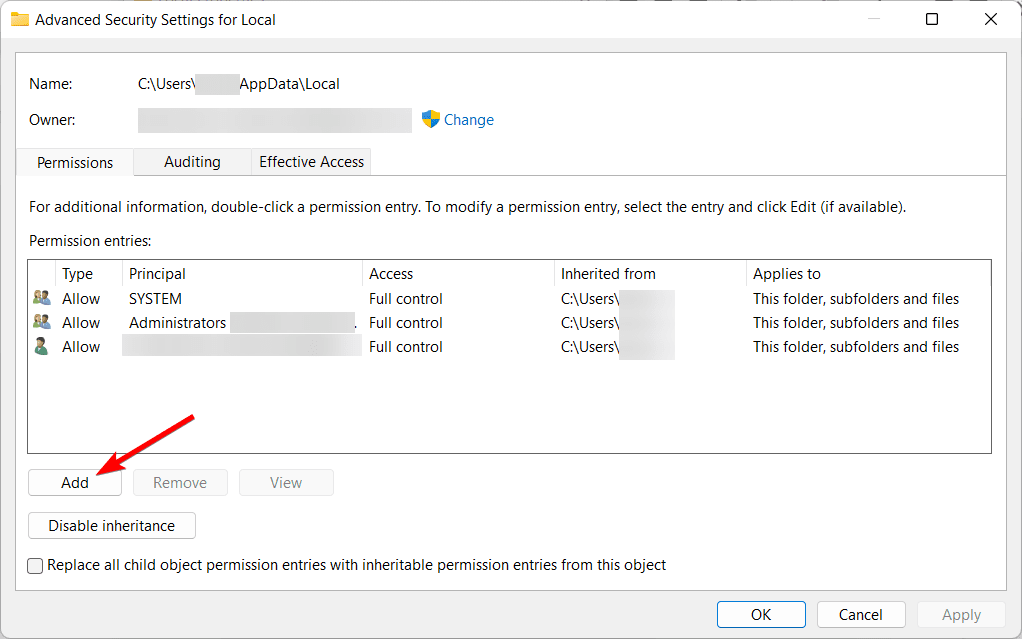 You can check if your User profile has complete control in this window and edit it if needed. If you want to add a user to have full permission to the folder, click Add to give the user access.