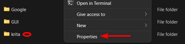 This will open up all your computer folders containing programs and other elements. Scroll down until you find the Krita folder, right-click and select Properties.