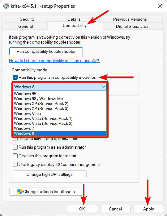 In some cases, Krita may not work on your current operating system, and you need to open the program using an older version. You can do this by opening Krita using compatibility mode.