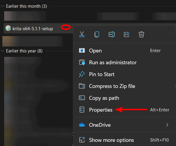 Once you locate the setup file, right-click and select Properties. You can also select the file and press Alt + Enter as a shortcut.