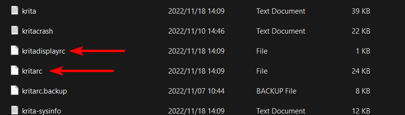 Once you are in this folder, search for the kritarc file and delete or rename it. You can also delete two more folders, kritaopenglrc and kritadisplayrc if you have these files in the folder.